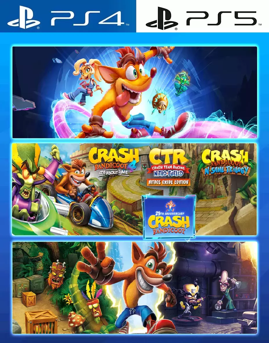 Con el CRASH LOTE CRASHIVERSARY, tendrás acceso exclusivo a Crash CTR, Crash Trilogy y Crash 4, todos disponibles en idioma español. Además, incluye una selección de contenido digital y físico que realza tu colección y te conecta más con el mundo Crash.